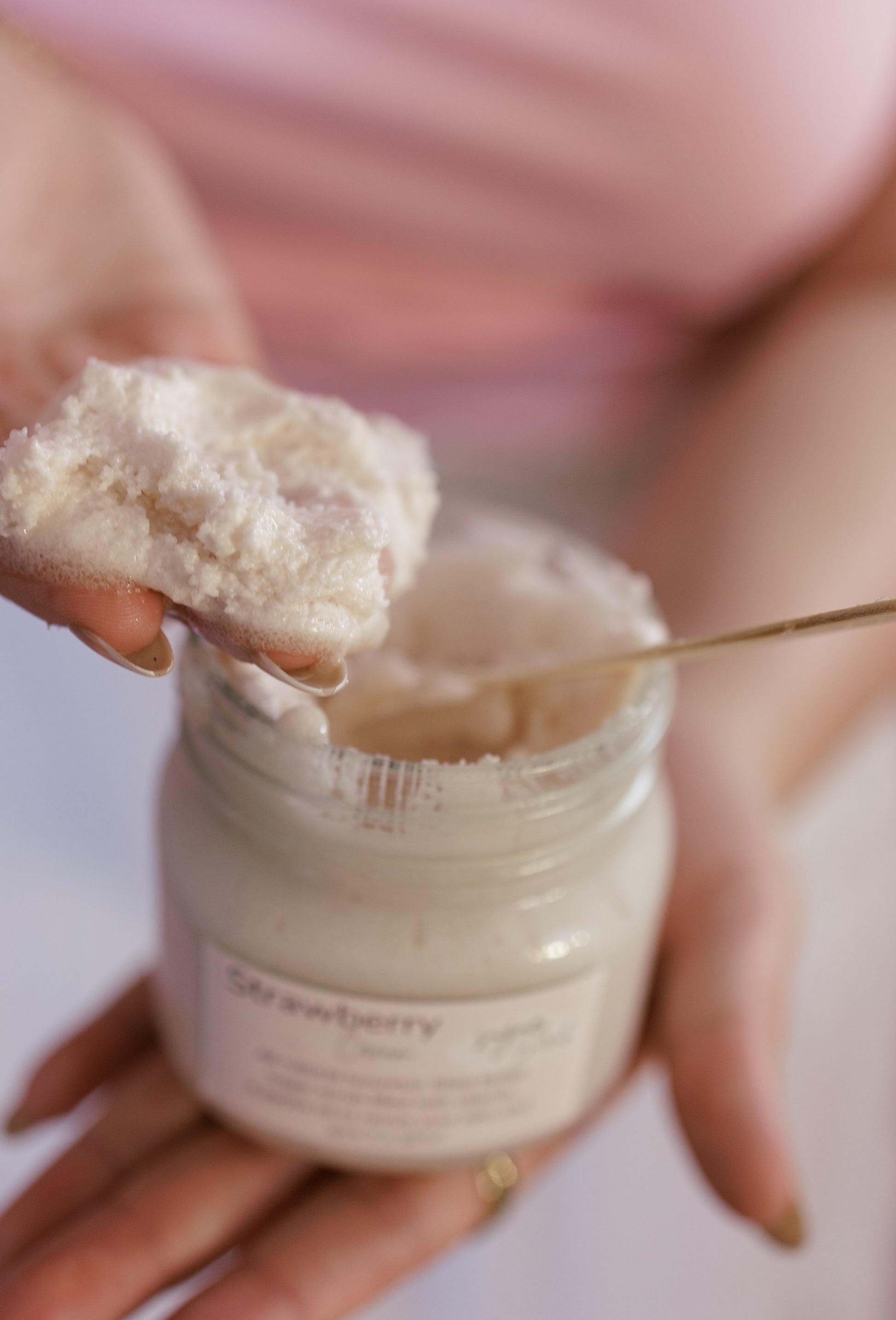 Girl! With our strawberry cream sugar scrub and body oil it won't only make you smell good it WILL take the feel of your skin to the next level! The ingredients are all natural so they heal the skin whiles moisturizing so you'll get that silky smooth glow and feel!!